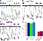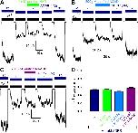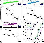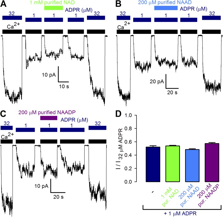 Figure 4. Purified pyridine dinucleotides do not compete activation of TRPM2 channels by ADPR. (A–C) Macroscopic T5L-TRPM2 currents elicited by cytosolic application of saturating Ca2+ (black bars) and either 32 or 1 µM ADPR (dark blue bars) alone, or a mixture of 1 µM ADPR with a high concentration of NUDT9-treated, filtered (“purified”) NAD (A, green bar), NAAD (B, blue bar), or NAADP (C, purple bar). (D) Fractional current activation by 1 µM ADPR alone (dark blue) or in combination with indicated concentrations of NUDT9-treated, filtered NAD (green), NAAD (blue), and NAADP (purple). Currents were normalized to those measured in 32 µM ADPR. Error bars represent mean ± SEM. |