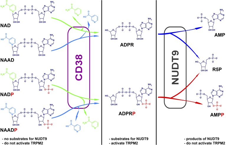 Figure 7. Summary of nucleotide structures and metabolic pathways of interconversion. Color coding: dark blue, ADPR core structure; green, nicotinamide; blue, nicotinic acid; red, 2′-phosphate. In living cells, ADPR and ADPRP are generated from pyridine dinucleotide precursors by the multifunctional enzyme CD38, and degraded into AMP(P) and ribose-5-phosphate by NUDT9. NUDT9 substrates are also activators of TRPM2. |