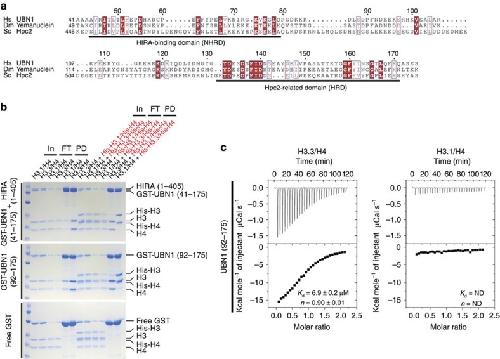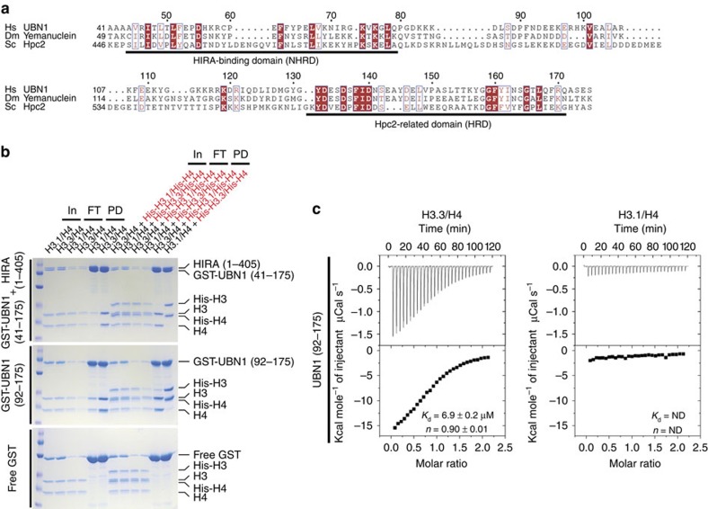 Figure 1. A region of UBN1 containing the Hpc2-related domain (HRD) is able to specifically bind to histone H3.3.(a) Sequence alignment comparing two highly conserved domains in Homo sapiens UBN1, Drosophila melanogaster Yemanuclein and Saccharomyces cerevisiae Hpc2. (b) GST pull-down histone-binding assay. Binding to H3.3/H4 and H3.1/H4 is tested separately in a single input H3/H4 pull-down (left), and in competition by subjecting an equimolar mixture of H3/H4 and His-H3/His-H4 to pull down (right). The H3.3-specific binding activity of GST-UBN1(41–175)/HIRA(1–405) (top), GST-UBN1(92–175) (middle) and free GST (bottom) is compared. (c) Isothermal titration calorimetry was used to quantitatively compare UBN1(92–175) binding with H3.3/H4 (left) and H3.1/H4 (right), ± values represent the standard error of the ITC fit using Origin 7.0. ND, not determined.