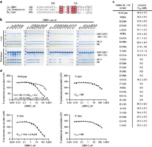 Figure 2. Conserved residues in the UBN1-HRD are required for binding with H3.3/H4.(a) Sequence alignment comparing HRD residues in Homo sapiens UBN1, Drosophila melanogaster Yemanuclein and Saccharomyces cerevisiae Hpc2, strictly conserved residues are highlighted in red. (b) GST pull-down assay comparing the H3.3-binding activity of UBN1 wild-type and 27 alanine scanning point mutants (A144 was mutated to I). (c) The IC50 for the binding with H3.3/H4 was quantified for each UBN1(92–175) variant using fluorescence polarization, ± values represent the standard error of the curves fit using GraphPad Prism 5.0a. (d) Four representative fluorescence polarization histone-binding curves are shown error bars represent the s.e.m. of three independent replicates. IC50, half-maximal inhibitory concentration; ND, not determined.