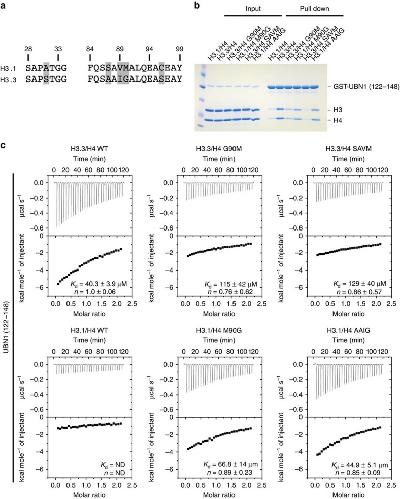 Figure 3. H3.3 residue G90 mediates UBN1 specificity.(a) Sequence alignment comparing human histones H3.1 and H3.3 with the five amino-acid differences highlighted in grey (b) GST pull-down assay comparing the ability of UBN1(122–148) to select between histone mutants where critical residues have been swapped between H3.1 and H3.3. UBN1 binding with wild-type H3.3/H4 and H3.1/H4 was analysed in addition to H3/H4 carrying several H3 mutants: H3.3(G90M), H3.1(M90G), H3.3(SAVM) and H3.1(AAIG). (c) Isothermal titration calorimetry quantification of the UBN1(122–148) interaction with wild-type and mutant H3/H4 complexes. Dissociation constant (Kd) and stoichiometry of UBN1 binding to H3/H4 are reported, ±values represent the standard error of the ITC fit using Origin 7.0. ND, not determined.