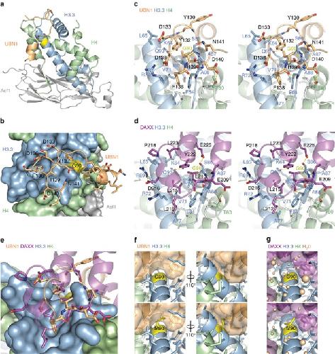 Figure 4. Crystal structure of the UBN1/H3.3/H4/Asf1 complex at 2.3-Å resolution.(a) Overall architecture of the UBN1/H3.3/H4/Asf1 complex with the position of H3.3 G90 highlighted in yellow. The structure is composed of UBN1 122–148, H3.3 60–133, H4 21–102 and Asf1 1–154. (b) UBN1 has an intimate association with the H3.3/H4 surface with close proximity to H3.3 G90 (yellow). UBN1 residues with sensitivity to alanine mutation are labelled. (c–d) Detailed stereo view of UBN1 and DAXX interactions with H3.3/H4 showing conserved interaction surfaces. (e) Alignment of the UBN1/H3.3/H4/Asf1 and DAXX/H3.3/H4 structures illustrating structural similarity between UBN1 and DAXX. (f) Surface representation of UBN1 shows that residues 128–132 rest closely over H3.3 G90 (top) and would likely sterically occlude binding with H3.1 M90 (bottom). M90 is represented by substitution of G90 with the highest percentage methionine rotamer. (g) The same view of the DAXX/H3.3/H4 structure shows that DAXX has a cavity where UBN1 128–131 resides. The comparable DAXX site fills with water molecules to sterically occlude binding with H3.1/H4.