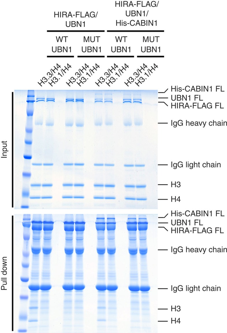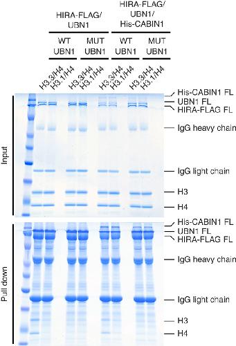 Figure 5. UBN1-HRD/H3.3 interface is required for H3.3-binding specificity in intact complexes.FLAG pull-down histone-binding assay. Recombinant complexes of HIRA-FLAG(FL)/UBN1(FL) and HIRA-FLAG(FL)/UBN1(FL)/His-CABIN1(FL) with wild-type and FID138-140AAA mutant UBN1 were analysed for binding to both H3.3/H4 and H3.1/H4.