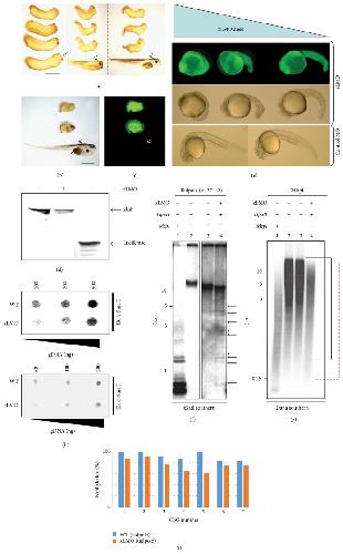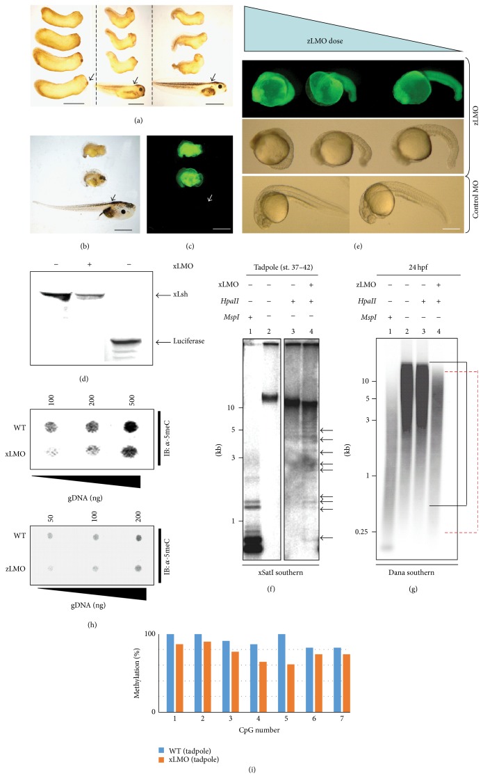 Figure 1. Lsh is essential for both Xenopus laevis and Danio rerio development. (aâc) Xenopus laevis embryos were injected with xLMO or control morpholinos and allowed to develop. Each panel shows examples of morphant embryos and a control embryo (black arrows). xLMO is fluorescein labelled and successfully injected embryos can be visualised under UV light (c). Developmental stages are (a) 28, 37-38, 42, (b) 42â45, (c) 42â45. Scale bar = 1âmm. (d) In vitro inhibition of xLsh coupled transcription-translation (TNT) with xLMO. 35S-Methionine labelled xLsh protein was prepared by TNT in the presence or absence of xLMO and products separated by PAGE. xLsh production was inhibited by xLMO (compare left and middle lanes). Band on lower right is TNT luciferase protein. (e) Danio rerio embryos were injected with zLMO and allowed to develop to the midsomite stage (24âhpf). Severity of phenotype is dose-dependent (compare panels left to right). UV light showing successful microinjection of three doses of zLMO and severity of phenotype (top panel, lateral view). Brightfield view of three doses of zLMO (middle panel, lateral view). Two representative brightfield control morpholino injected embryos (lower panel, lateral view). Scale bar = 300âμm. (f) Southern blot analysis of genomic DNA isolated from control- and xLMO-injected tadpole embryos using a dispersed repeat xSatI probe. DNA was digested with either HpaII (methylation-sensitive) or MspI (methylation-insensitive HpaII isoschizomer), resolved and probed with radiolabelled xSatI. Digestion with HpaII indicates that xLMO DNA from tadpoles is more frequently cut as indicated by the low molecular weight banding pattern (black arrows) compared to control-injected genomic DNA. (g) Southern blot analysis of genomic DNA isolated from control- and zLMO-injected 24âhpf embryos using a Danio rerio Dana probe. A similar approach was taken as in (f). Compare the extent of HpaII digestion in lane 3 (control) and lane 4 (zLMO). Black bracket = wild type HpaII profile; dashed red bracket = zLMO HpaII profile. DNA sizes are indicated in kilobases to the left of each gel. (h) Upper: dot blot of Xenopus laevis genomic DNA probed with 5-methylcytosine antibody. Note the weaker binding of antibody to the xLMO DNA indicating global hypomethylation; lower: dot blot of Danio rerio genomic DNA probed with 5-methylcytosine antibody. Note the reduced binding of antibody to the zLMO DNA indicating global hypomethylation. (i) Summary of bisulfite sequencing of xSat in wild type and xLMO tadpole embryos. Vertical axis: % methylation; horizontal axis: each CpG in xSat amplicon. |