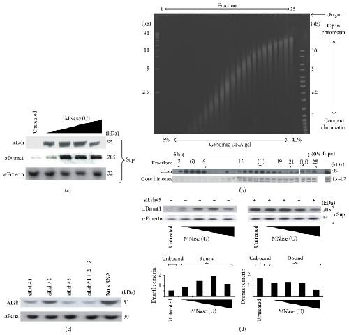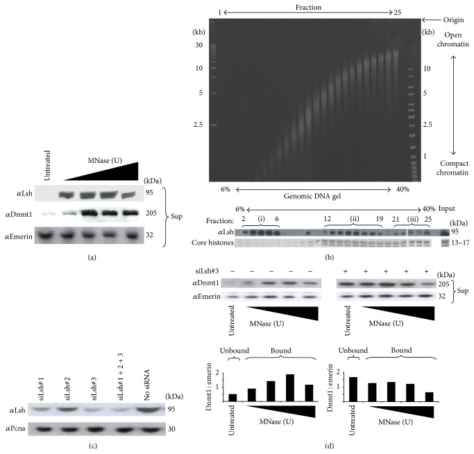 Figure 3. Lsh is associated with chromatin and is required for Dnmt1-chromatin association. (a) MNase treatment of 293T nuclei indicates that endogenous Lsh and Dnmt1 are chromatin bound (see untreated lanes). (b) Endogenous Lsh is associated with soluble chromatin. Sucrose gradient sedimentation was used to fractionate 3T3 soluble chromatin and both protein and genomic DNA were isolated from each fraction. Fractionation of chromatin was validated by DNA gel electrophoresis of all gradient fractions. Western blotting of fractions shows that mLsh (free) is enriched at the top of the gradient (open chromatin) and also cosediments with bulk chromatin (chromatin bound) in the middle and end of the gradient (compact chromatin). (c) siRNAs against human Lsh were tested in knockdown experiments in 293T cells and siLsh#3 gives ~70% knockdown. (d) Lsh is required for the Dnmt1-chromatin association. Comparison of wild type and siRNA treated 293T cells by MNase treatment of nuclei shows that Dnmt1:chromatin association is decreased in knockdown cells (comparison of amounts of Dnmt1 released into the supernatant show higher levels released in knockdown cells). Densitometry of the western blots shows that Dnmt1 is enriched in the chromatin bound fraction (left panel); knockdown of Lsh shifts Dnmt1 into the unbound fraction. Emerin was used as a control for a protein which is unaffected by MNase treatment. |