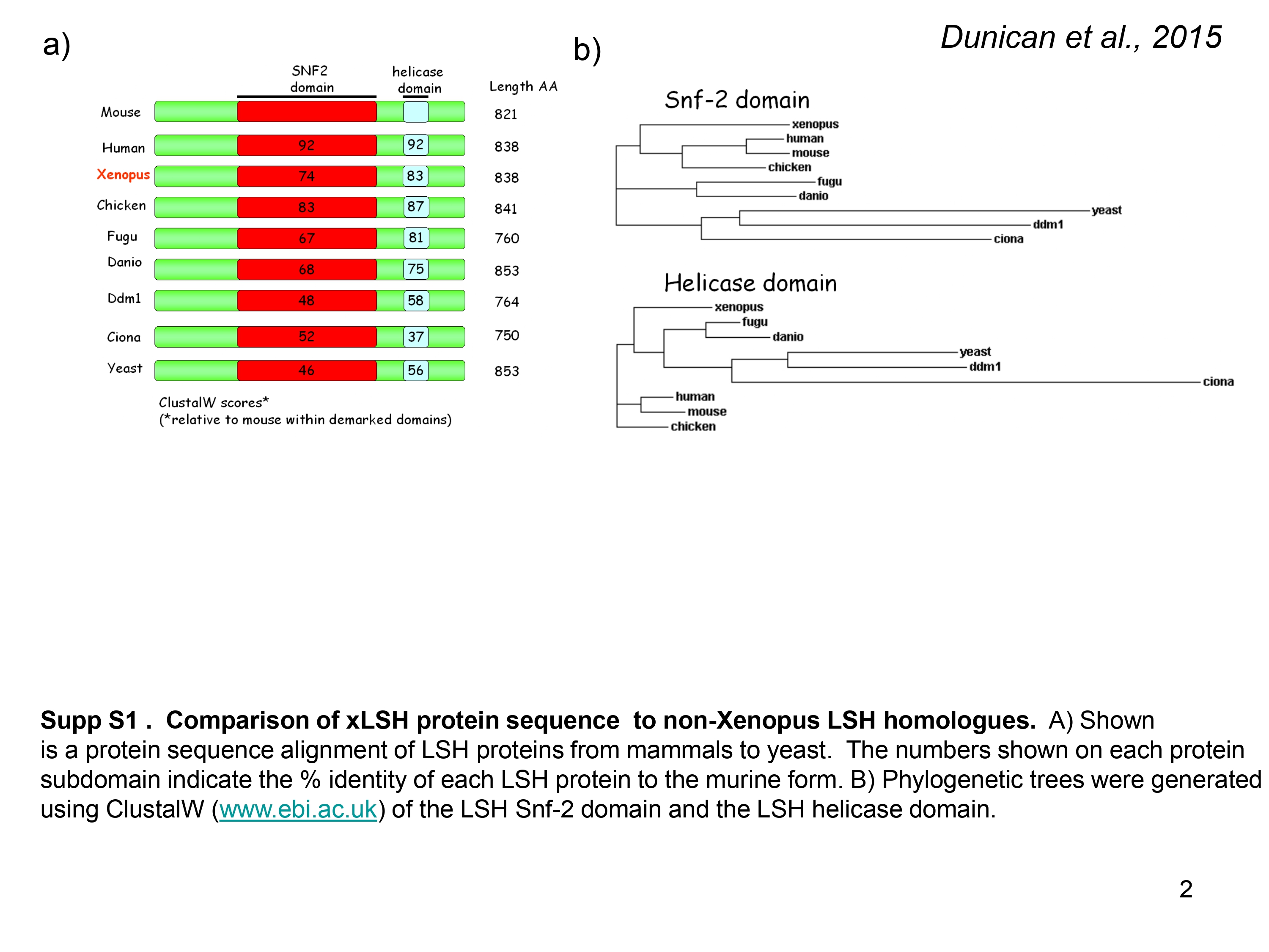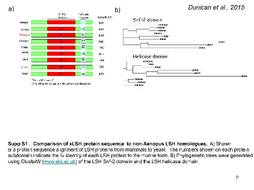 Supp S1 . Comparison of xLSH protein sequence to non-Xenopus LSH homologues. A) Shown is a protein sequence alignment of LSH proteins from mammals to yeast. The numbers shown on each protein subdomain indicate the % identity of each LSH protein to the murine form. B) Phylogenetic trees were generated using ClustalW (www.ebi.ac.uk) of the LSH Snf-2 domain and the LSH helicase domain. |
