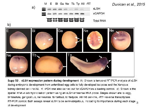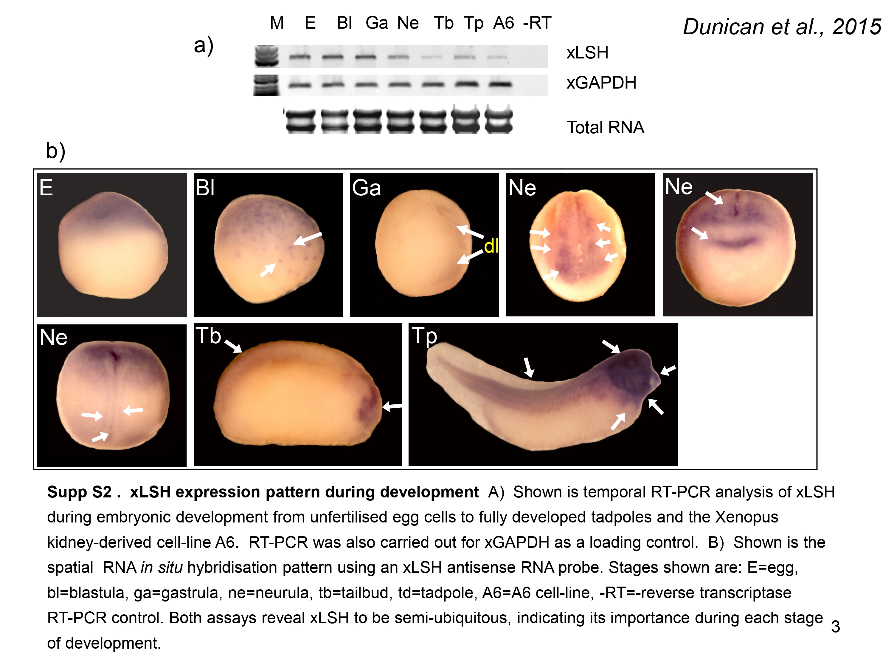 Supp S2 . xLSH expression pattern during development A) Shown is temporal RT-PCR analysis of xLSH during embryonic development from unfertilised egg cells to fully developed tadpoles and the Xenopus kidney-derived cell-line A6. RT-PCR was also carried out for xGAPDH as a loading control. B) Shown is the spatial RNA in situ hybridisation pattern using an xLSH antisense RNA probe. Stages shown are: E=egg, bl=blastula, ga=gastrula, ne=neurula, tb=tailbud, td=tadpole, A6=A6 cell-line, -RT=-reverse transcriptase RT-PCR control. Both assays reveal xLSH to be semi-ubiquitous, indicating its importance during each stage 3 of development. |