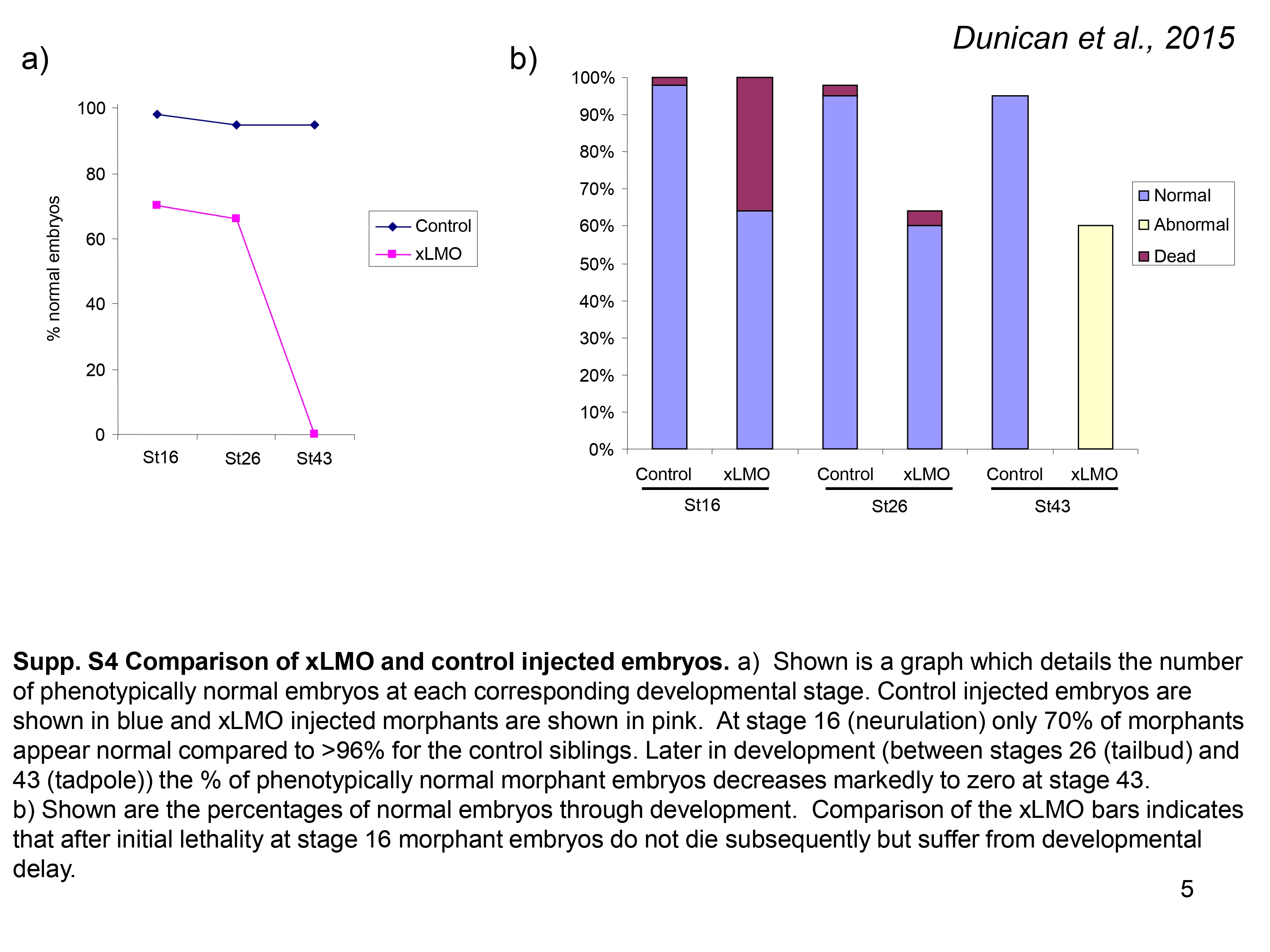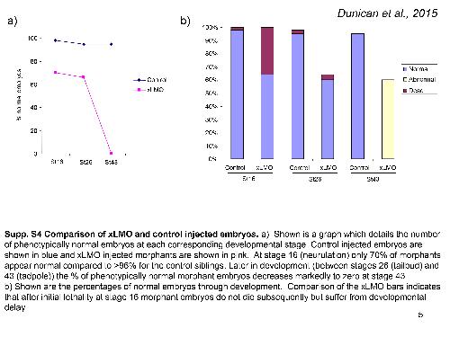 Supp. S4 Comparison of xLMO and control injected embryos. a) Shown is a graph which details the number of phenotypically normal embryos at each corresponding developmental stage. Control injected embryos are shown in blue and xLMO injected morphants are shown in pink. At stage 16 (neurulation) only 70% of morphants appear normal compared to >96% for the control siblings. Later in development (between stages 26 (tailbud) and 43 (tadpole)) the % of phenotypically normal morphant embryos decreases markedly to zero at stage 43. b) Shown are the percentages of normal embryos through development. Comparison of the xLMO bars indicates that after initial lethality at stage 16 morphant embryos do not die subsequently but suffer from developmental delay. |