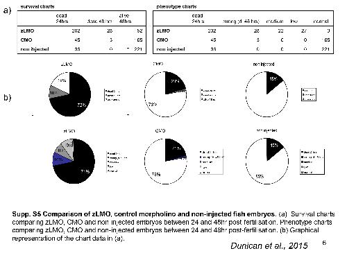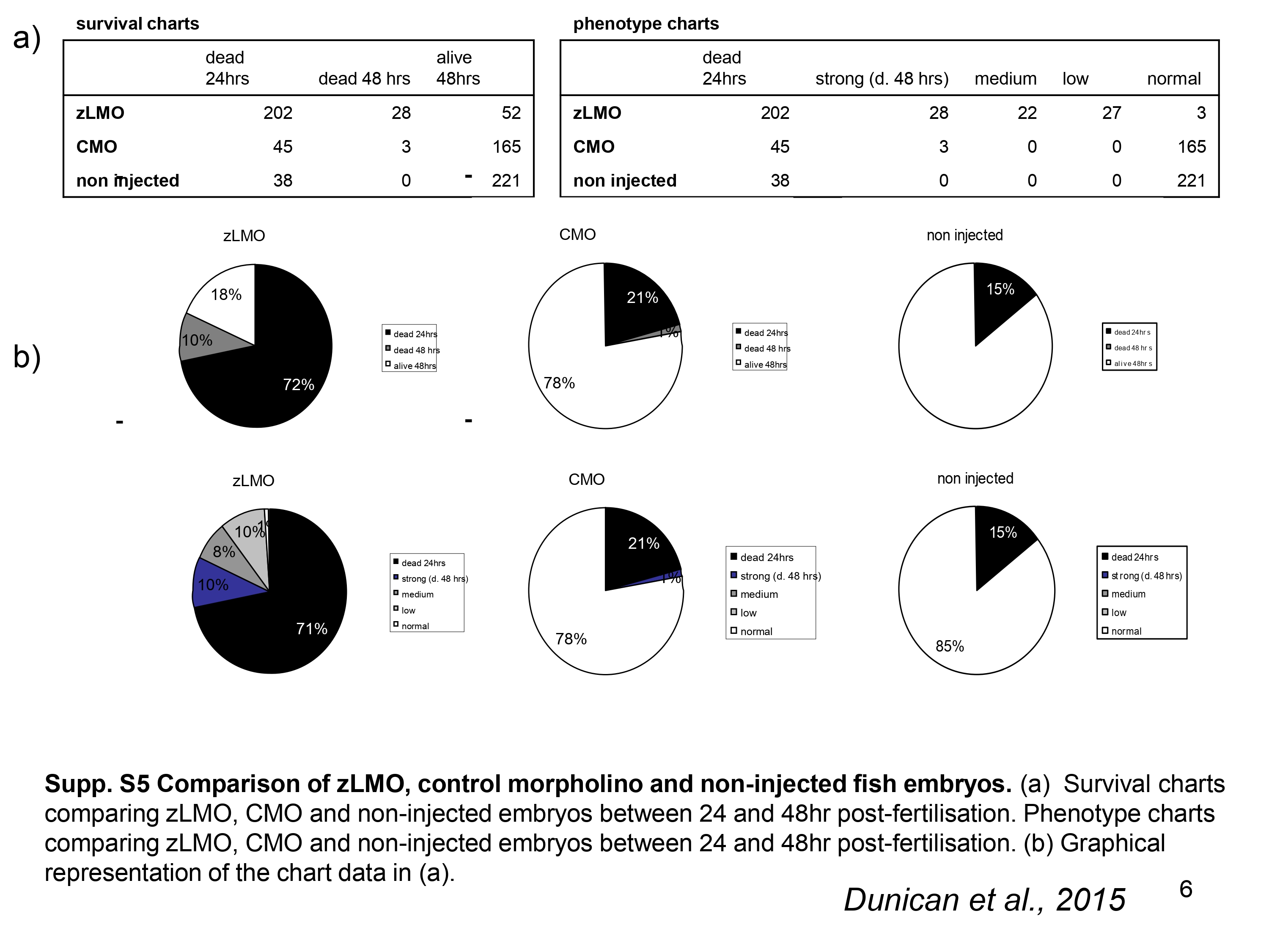 Supp. S5 Comparison of zLMO, control morpholino and non-injected fish embryos. (a) Survival charts comparing zLMO, CMO and non-injected embryos between 24 and 48hr post-fertilisation. Phenotype charts comparing zLMO, CMO and non-injected embryos between 24 and 48hr post-fertilisation. (b) Graphical representation of the chart data in (a). |