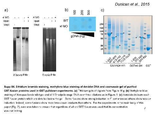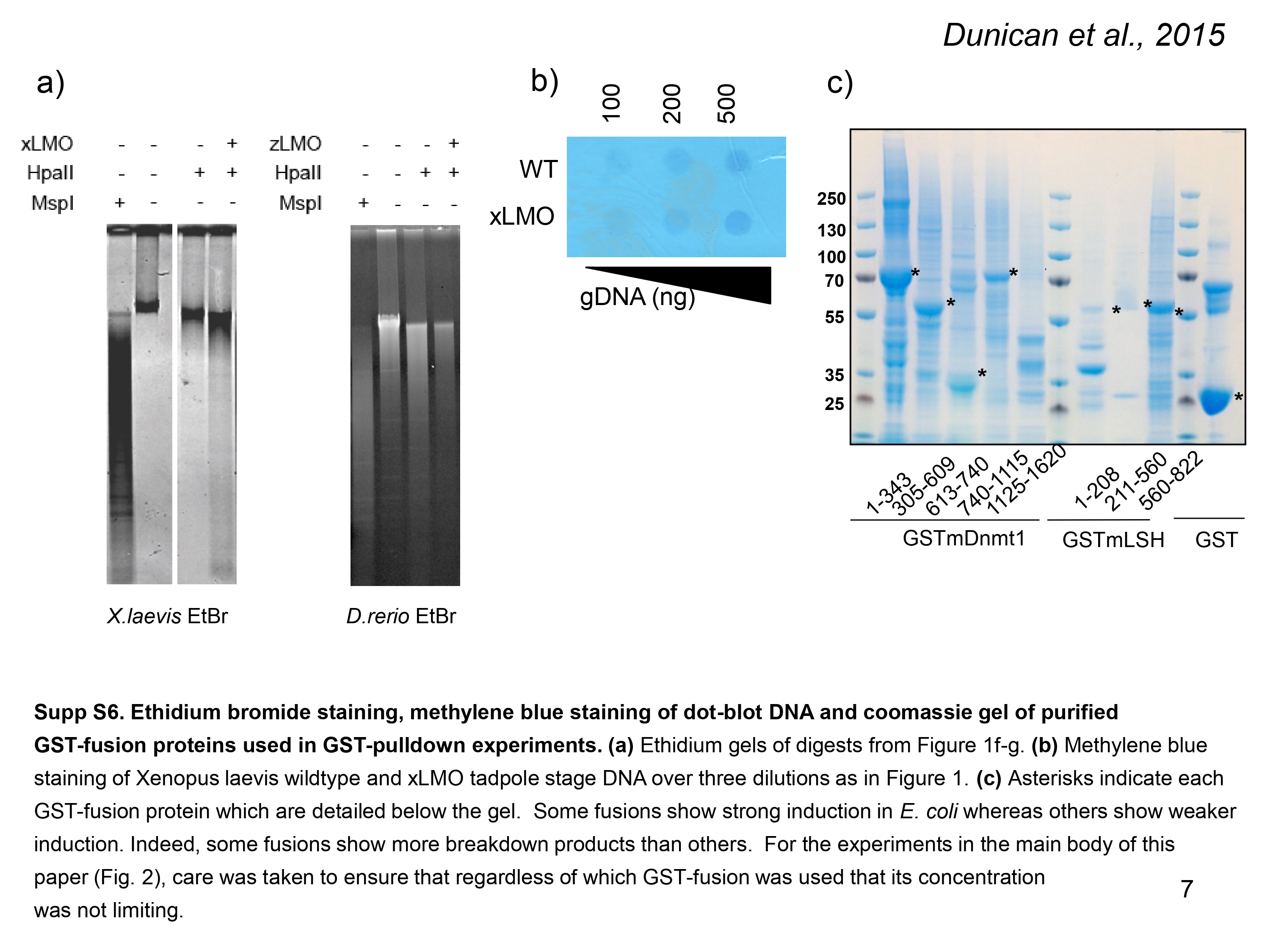 Supp S6. Ethidium bromide staining, methylene blue staining of dot-blot DNA and coomassie gel of purified GST-fusion proteins used in GST-pulldown experiments. (a) Ethidium gels of digests from Figure 1f-g. (b) Methylene blue staining of Xenopus laevis wildtype and xLMO tadpole stage DNA over three dilutions as in Figure 1. (c) Asterisks indicate each GST-fusion protein which are detailed below the gel. Some fusions show strong induction in E. coli whereas others show weaker induction. Indeed, some fusions show more breakdown products than others. For the experiments in the main body of this paper (Fig. 2), care was taken to ensure that regardless of which GST-fusion was used that its concentration was not limiting. |