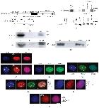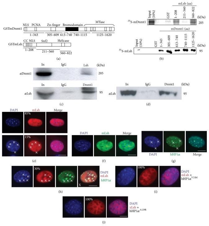 Figure 2. Lsh and Dnmt1 proteins interact in vitro and in vivo and Lsh is predominantly excluded from pericentric heterochromatin. (a) Cartoon of Lsh and Dnmt1 GST-fusions used. Individual fusions are indicated by numbering under each protein. (b) Direct interaction between Lsh and Dnmt1. Top: mLsh GST-fusions 1–208 and 560–822 pulldown radiolabelled full-length mDnmt1. Bottom: mDnmt1 GST pulldown radiolabelled full-length mLsh. All assays performed in the presence of 50 μg/mL ethidium bromide. (c) Full-length tagged Dnmt1 and Lsh can interact in vivo in cultured cells. Tagged proteins (GFP-xDnmt1 and T7-xLsh) were transfected into 293T cells and immunoprecipitated under high salt conditions (250 mM NaCl). Both proteins coimmunoprecipitate reciprocally (see IP lanes, right of each panel). (d) Endogenous immunoprecipitation of human Lsh and Dnmt1 in SW620 cells. (e) Lsh is predominantly nuclear diffuse. Expression of tagged (cherry red) mLsh in p53−/− MEF. White arrows indicate less frequent colocalisation with pericentric heterochromatin. n = 100. (f) Expression of previously published [29] GFP-tagged mLsh is nuclear diffuse; in contrast, expression of GFP-tagged HP1α overlaps with pericentric heterochromatin foci (white arrows). n = 100. (g) Coexpression of Lsh and HP1α drives Lsh to heterochromatin. n = 80. (h-i) HP1α mutants (V21M-chromodomain and A129R-chromoshadow domain) do not redirect Lsh to heterochromatin. n = 90. |