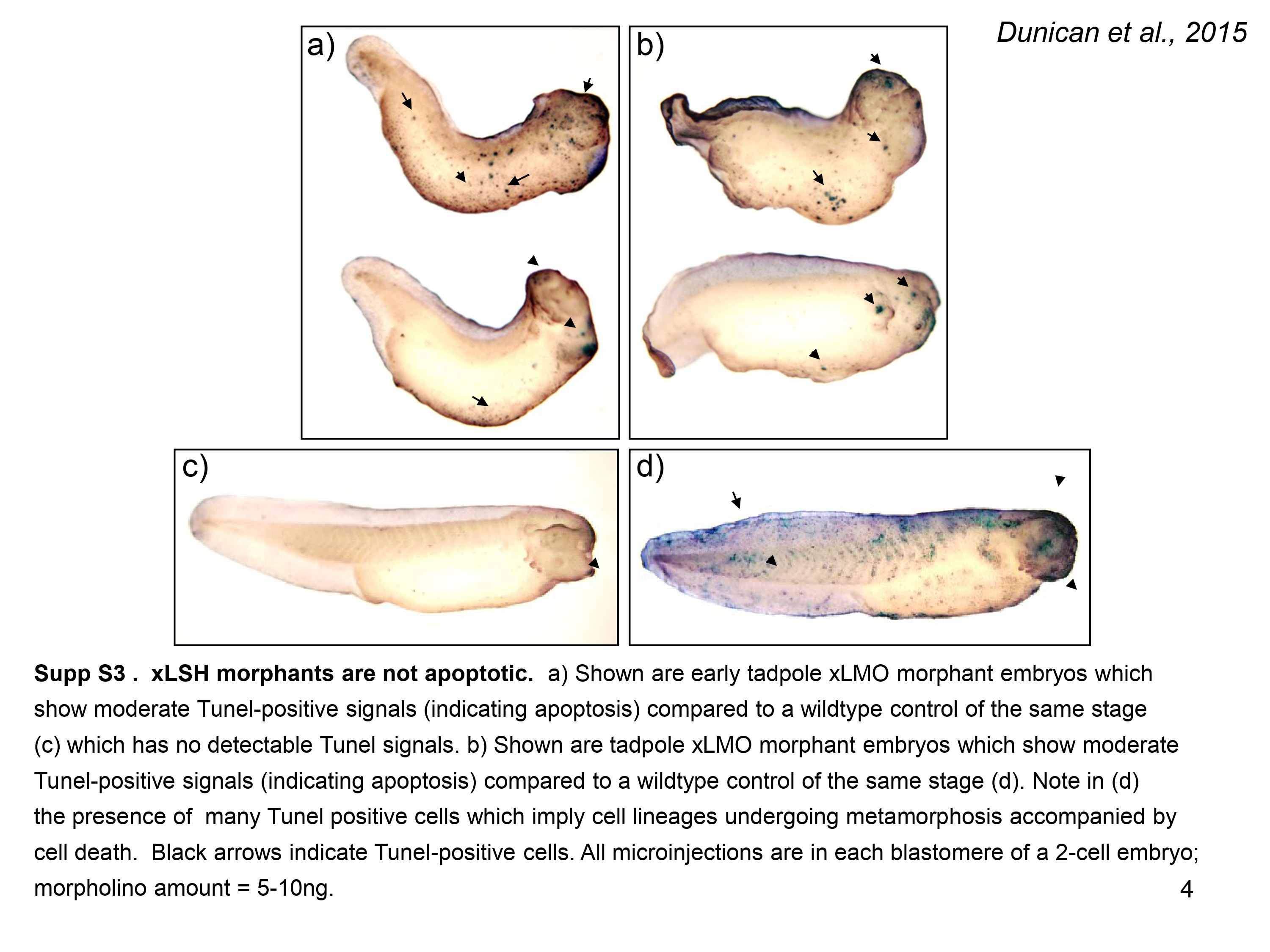 Supp S3 . xLSH morphants are not apoptotic. a) Shown are early tadpole xLMO morphant embryos which show moderate Tunel-positive signals (indicating apoptosis) compared to a wildtype control of the same stage (c) which has no detectable Tunel signals. b) Shown are tadpole xLMO morphant embryos which show moderate Tunel-positive signals (indicating apoptosis) compared to a wildtype control of the same stage (d). Note in (d) the presence of many Tunel positive cells which imply cell lineages undergoing metamorphosis accompanied by cell death. Black arrows indicate Tunel-positive cells. All microinjections are in each blastomere of a 2-cell embryo; morpholino amount = 5-10ng. |