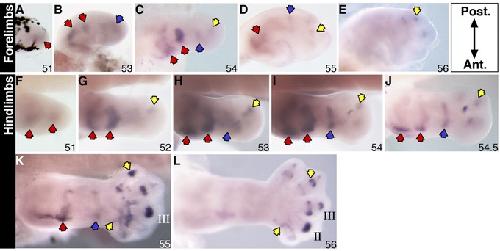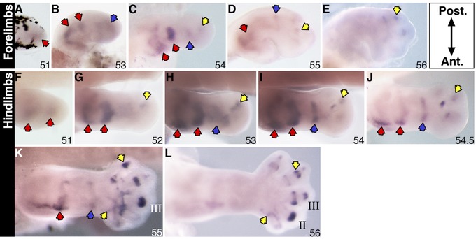 Sulf1 expression in X. laevis stage 51â56 forelimbs (AâE) and stage 51â56 hindlimbs (FâL) examined by a whole mount in situ hybridization. Specific staining is dark purple. Red arrows in the more proximal part indicate gene expression at the putative shoulder/hip and elbow/knee joints; blue arrows indicate expression at the future wrist/ankle joints; yellow arrows indicate transcript expression in the autopod region. Roman numerals indicate digit number. All limbs are oriented proximal to the left and posterior uppermost, with the tadpoles lying on their right side.