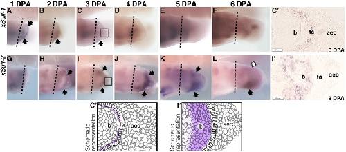 X. laevis sulf1 (AâF) and sulf2 (GâL) expression in regenerating hindlimbs originally operated at developmental stage 52 examined by a whole mount in situ hybridization. Specific staining is dark purple. Black arrows point to regions of transcript expression that is specific to regeneration; empty arrows indicate reduced level of expression. The original site of amputation is indicated by the black dotted line. Boxed region in C and I indicate area of histological section as shown in Câ² and Iâ² respectively, accompanied by their respective schematics. All limbs are oriented proximal to the left and posterior uppermost, with the tadpoles lying on their right side. aec, apical epidermal cap; fa, functional aec; b, blastema.