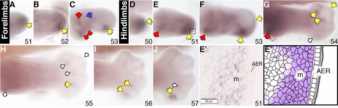 Sulf2 expression in X. laevis stage 51â53 forelimbs (AâC) and stage 50â57 hindlimbs (DâJ) examined by a whole mount in situ hybridization. Specific staining is dark purple. Red arrows in the more proximal part indicate gene expression at the putative shoulder/hip and elbow/knee joints; blue arrows indicate expression at the future wrist/ankle joints; yellow arrows indicate transcript expression in the autopod region; empty arrows indicate reduced level of expression. Roman numerals indicate digit number. The boxed region in E indicates area of histological section shown in Eâ², accompanied by the corresponding schematic (Eâ²) showing area of gene expression in the mesenchyme. All limbs are oriented proximal to the left and posterior uppermost, with the tadpoles lying on their right side. AER, apical epidermal ridge; m, mesenchyme.