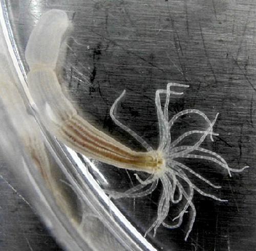 Figure 1. The starlet sea anemone.The cnidarians, such as the starlet sea anemone (N. vectensis) shown here, have a body form that is very different to the bilaterally symmetrical form found in most other animals. Anemones have a mouth surrounded by tentacles at one end and a foot that attaches to the substrate at the other. Hudry et al. have shown that, despite such a difference in general body form, the Hox-TALE system that operates in the development of cnidarians functions in a similar fashion to the Hox-TALE system of flies and mice.