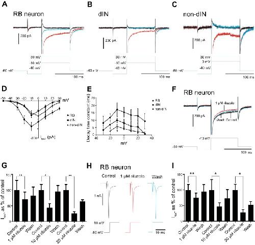 Fig. 2. Properties of INaP in the 3 neuron groups and the effect of riluzole. A–C: sodium currents in an RB neuron (A), a dIN (B), and a non-dIN (C) in response to voltage step to −40 (black traces), −10, or 0 mV (red traces showing the maximal INaP) and to 30 mV (blue traces). D: averaged I-V curves for the INaP in RB neurons, dINs, and non-dINs. E: decay time constants of INaP at steps to different membrane potentials in RB neurons, dINs, and non-dINs. F: effect of 1 µM riluzole on INaP in an RB neuron. G: blocking effects of 1, 10, and 20 µM riluzole on INaP. H: effect of 1 µM riluzole on INaT in an RB neuron. I: effect of 1, 10, and 20 µM on INaT. *P < 0.05; **P < 0.01.