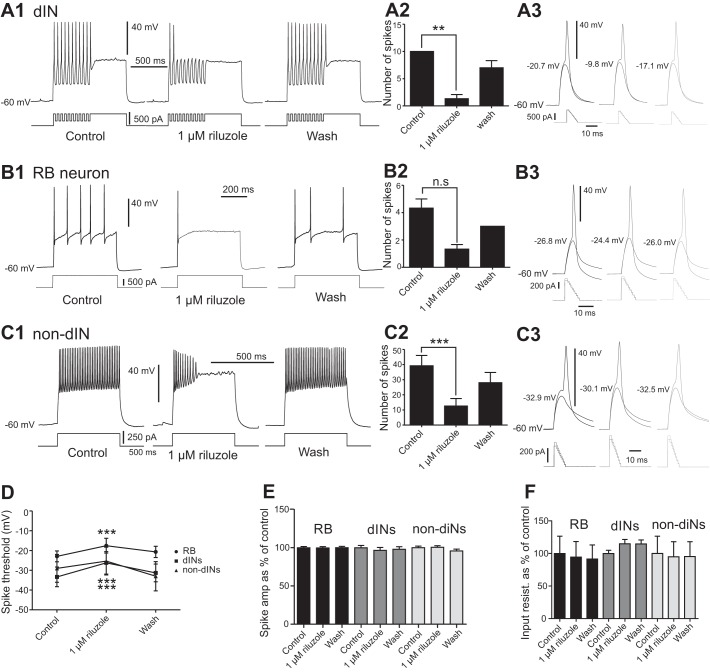 Fig. 3. Effects of riluzole on firing properties of the 3 different neuron groups. A1: effect of 1 µM riluzole on the rebound firing in a dIN. A2: bar chart summarizing the reduction of rebound spikes in dINs (n = 6). A3: subthreshold depolarization and firing at threshold level in a dIN in control (left), 1 µM riluzole (**P < 0.01; middle), and wash (right). B1: effect of riluzole on an RB neuron with slow, repetitive firing. B2: bar chart showing the reduction of spikes by riluzole (n = 3). B3: subthreshold depolarization and firing at threshold level in an RB neuron in control (left), 1 µM riluzole (middle), and wash (right). C1: effect of riluzole on the repetitive spiking in a non-dIN. C2: reduction of number of spikes by riluzole (n = 9). C3: subthreshold depolarization and firing at threshold in a non-dIN in control (left), 1 µM riluzole (middle), and wash (right). D: effect of riluzole on the spike thresholds in RB neurons (n = 6), dINs (n = 4), and non-dINs (n = 5). *P < 0.05; **P < 0.01; ***P < 0.001. E: lack of effects of riluzole on spike amplitudes in RB neurons, dINs, and non-dINs. F: lack of effects of riluzole on input resistances in RB neurons, dINs, and non-dINs.
