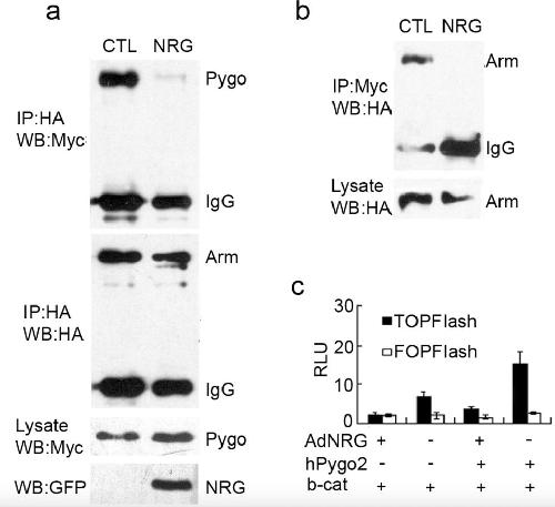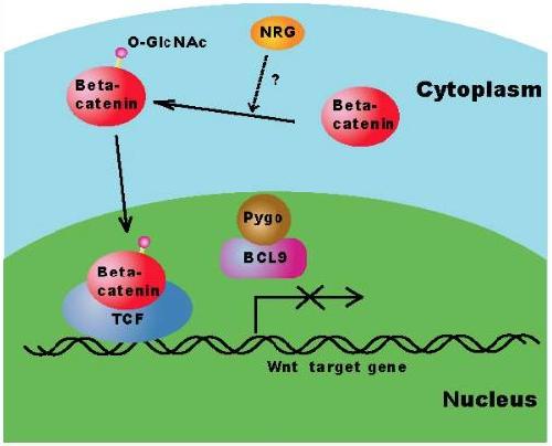 The Wnt pathway is crucial for animal development, as well as tumor formation. Understanding the regulation of Wnt signaling will help to elucidate the mechanism of the cell cycle, cell differentiation and tumorigenesis. It is generally accepted that in response to Wnt signals, β-catenin accumulates in the cytoplasm and is imported into the nucleus where it recruits LEF/TCF transcription factors to activate the expression of target genes. In this study, we report that human NRAGE, a neurotrophin receptor p75 (p75NTR) binding protein, markedly suppresses the expression of genes activated by the Wnt pathway. Consistent with this finding, loss of function of NRAGE by RNA interference (RNAi) activates the Wnt pathway. Moreover, NRAGE suppresses the induction of axis duplication by microinjected β-catenin in Xenopus embryos. To our surprise, NRAGE induces nuclear localization of β-catenin and increases its DNA binding ability. Further studies reveal that NRAGE leads to the modification of β-catenin/Arm with O-linked beta-N-acetylglucosamine (O-GlcNAc), and failure of the association between β-catenin/Arm and pygopus(pygo) protein, which is required for transcriptional activation of Wnt target genes. Therefore, our findings suggest a novel mechanism for regulating Wnt signaling.