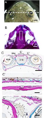 Medial head skin overlies bone, not muscle. A: Brightfield view of the rostral portion of a Xenopus laevis froglet. B: Whole-mount bone staining of a froglet with Alizarin red. C: The head region was stained with Elastica van Gieson and Alcian blue and sectioned through the plane indicated by the dotted line in A. Bra, brain; sku, skull. C',C”: Magnified views of the rectangles in C. The white rectangle in B indicates the medial-dorsal area of the head where the overlying skin was excised in Fig. 1. No subcutaneous muscles were observed in the medial head area C'. Open arrowheads (C”) enclose ocular muscles. A–C: Bar = 1 mm. C',C”: Bar = 100 µm.