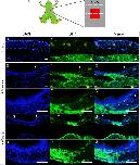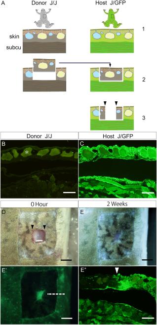 Cell-fate tracing of subcutaneous tissues and regenerating skin in a froglet. A: Procedure for cell-fate analysis by skin grafting. The gray froglet represents a J-strain (J/J) individual; the green froglet represents a JG-hybrid (J/GFP) individual. 1: Skin and subcutaneous tissues are ubiquitously labeled with GFP in the J/GFP froglet. 2: A full-thickness skin piece was grafted from the J/J donor to the J/GFP recipient. 3: Once the grafted skin was accepted by the recipient, skin in the center of the graft, including the dermis, was excised. Subcu, subcutaneous tissues. B: Intact skin from a J-strain (n = 1) and (C) JG-hybrid (J/GFP) froglet (n = 1). D: Brightfield view of the skin wound in the graft area immediately after excision. E,E': Brightfield (E) and GFP-fluorescence (E') views of the skin wound 2 weeks after injury. E”: The sample was sectioned through the plane indicated by the dotted line in E' and immunostained with an anti-GFP antibody. The grafted skin was rarely invaded by GFP-positive host-derived cells. Black arrowheads indicate the wound site; white arrowhead indicates the host-graft boundary. B,C,E”: Bar = 200 µm. D,E,E': Bar = 2 mm.