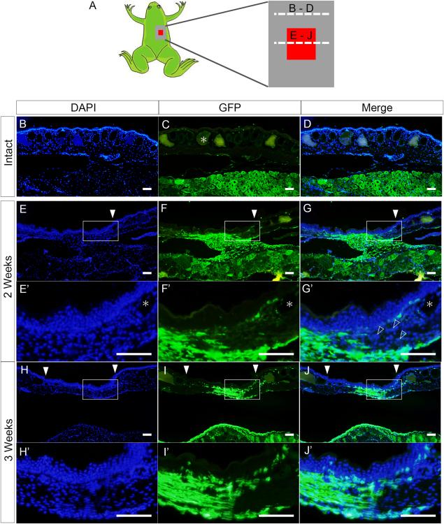 Cells derived from subcutaneous tissues contribute to skin regeneration. A: Illustration of a metamorphosed froglet indicating the transverse planes of sections shown as B-J and as E'-J'. Gray and red rectangles represent the grafted donor skin and excisional skin wound, respectively. B–D: Samples of intact skin regions were sectioned through the plane indicated by the dotted line as “B–D” in A. GFP-positive subcutaneous tissues were observed beneath the GFP-negative grafted skin. E–J: Samples of regenerating skin, including subcutaneous tissues, were sectioned through the plane indicated by the dotted line “E–J” at 2 or 3 weeks after skin excision. E–G: GFP-positive cells had accumulated underneath the GFP-negative wound epidermis at 2 weeks after skin injury (n = 4). Three of four individuals showed basically the same results. H–J: GFP-positive cells contributed to the regenerated skin, especially to the dermis in the center of the wound (n = 4). Four of four individuals showed basically the same results. Asterisks indicate secretion glands. White arrowheads (E–G) indicate the right-hand border of the wound. Pairs of white arrowheads (H–J) indicate the left- and right-hand borders of the wound. Open arrowheads indicate GFP-negative cells contributing to the dermis of the regenerating skin. Bar = 100 µm.