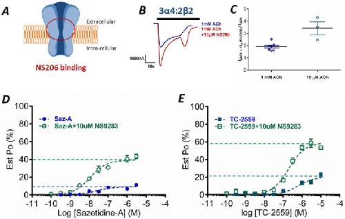 Fig 3. Estimation of open probability.A Schematic depicting the hypothesized areas for NS206 binding [34]. B Representative current trace of the response of the 3α4:2β2 receptor to 1 mM ACh (blue) and 1 mM ACh co-applied with 10 μM NS206 to estimate open channel probability. C The level of NS206 (10μM) positive modulation of ACh currents for the WT. D Saz-A and E TC-2559 concentration-response curves in the absence (blue) and presence (green) of 10 μM NS9283 normalized to 1 mM ACh co-applied with 10 μM NS206 (Est Po,max) at 3α4:2β2 receptors. Dots represent the mean ± s.e.m.