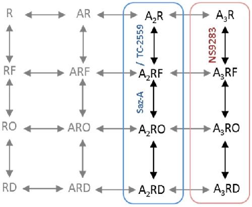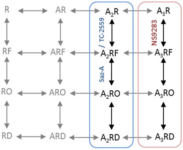 Fig 6. Proposed model.A schematic of proposed receptor model for the activation of WT 3α4:2β2 nAChR. The model includes unbound (R), one agonist bound (AR), two agonist bound (A2R) and three agonist bound (A3R) receptor states. Intermediate ‘flip’ state (RF), Open state (RO) and desensitized state (RD) are shown. Blue frame includes receptor activation model for agonists (eg. Saz-A and TC-2559) that selective bind at the α4-β2 interface and red frame shows receptor activation for ligands selective for α4-α4 interface (NS9283). Dashed lines and grey states indicate transitions and states not discretely tested in our experiments but are considered likely to exist.
