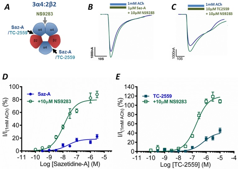 Fig 2. Saz-A and TC-2559 co-application with NS9283: A Schematic of the 3α4:2β2 receptor with the binding sites of Saz-A and TC-2559 at the α4-β2 interface, and NS9283 at the α4-α4 interface. Representative current trace of B. Saz-A and C. TC-2559, co-applied with NS9283 (10μM) (Green) compared to max ACh (1mM) current on 3α4:2β2 receptors D Saz-A and E TC-2559 concentration-response curves in the absence (blue) and presence (green) of 10 μM NS9283 normalized to 1 mM ACh at 3α4:2β2 receptors. Dots represent the mean ± s.e.m.