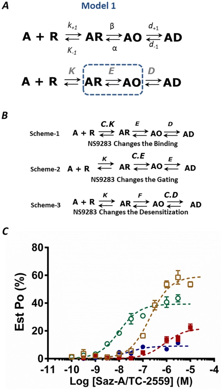 / k+1; the gating equilibrium constant is E = β / α; and the desensitization equilibrium constant D = d+1/d−1. B. Three schemes from 1–3, represent the proposed model to test whether NS9283 changes the gating (E), desensitization (D) or binding (K) equilibrium constants to elicit its effect. C. Saz-A (blue) and TC-2559 (maroon) by themselves and in the presence of NS9283 (Saz-A—Green; TC-2559—brown) were plotted (mean ± s.e.m.) (data from Fig 2E and 2F). The dotted curves represent predicted open-probability responses from the model for the control (Saz-A—Blue dotted; TC-2559 –Maroon dotted) and when gating constant (E) was multiplied by the constant CE (Saz-A—Green dotted; TC-2559—Brown dotted).