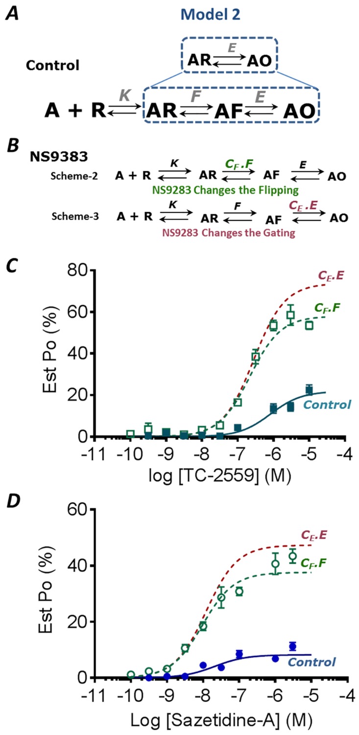 Fig 5. Model-2.A. Linear Model of receptor activation incorporating an intermediate flip state (AF) between ligand bound (AR) and open (AO) states. Dotted box suggests that the gating step from Fig 4 is extended to include flipping step in this model. B. Proposed schemes represent when NS9283 changes the pre-activation (F) or gating (E) constants. The equilibrium constants were estimated using Scheme 2. All equilibrium constants are defined as previously, and F is equal to the forward rate/reverse rate. C TC-2559 and D Saz-A data plotted (mean ± s.e.m.) is same as Fig 4, while the dotted curves represent predicted open-probability curves from Models 2 where either the pre-activation constant (F green) or the gating constant (E red) were multiplied by the constant CF or CE respectively.