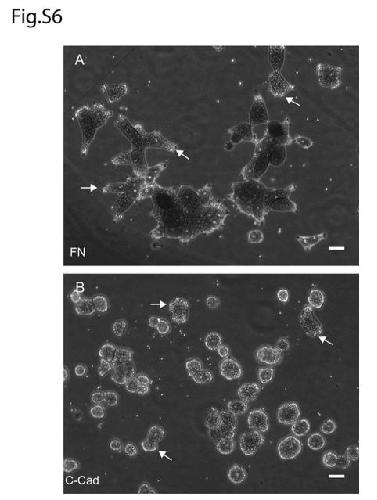 Fig. S6: Mesendoderm Cell morphology on FN and C-cad-FC substrates. (A-B) Representative images of dissociated mesendoderm cells plated on plastic dishes coated with (A) 10μg/ml FN and (B) 5μg/ml C-Cad-FC. After 1 hour, many of these cells have made contact and form small clusters. The morphology of these cells is similar to that observed on stretchable silicon substrates (e.g., Fig. 5A-D) but images of cells on coated plastic substrates are shown here because of the better optical quality. Protrusions are indicated by arrows. Scale bar=50um (A-B). |