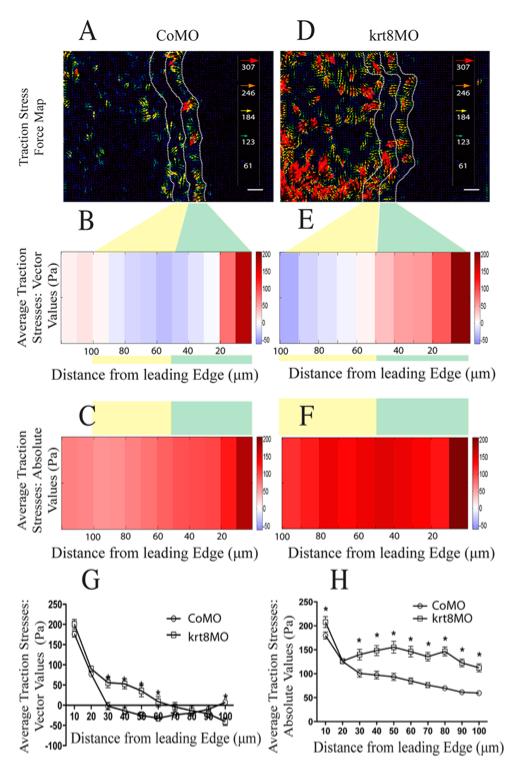 Fig. 1. Distribution of traction stresses in control and keratin morphant explants on FN substrates. (A,D) Representative traction stress maps for control (A) and krt8 morphant (D) mesendoderm explants. Arrows indicate the magnitudes and directions of traction stresses. The distance between white dotted lines, 50 μm, is approximately the width of one cell row. Green and yellow highlighted areas between vertical panels correspond to leading and second rows of cells, respectively. Heat maps were binned into 10-μm slices starting from the leading edge. (B,C,E,F) Average vector (B,E) and absolute (C,F) values of traction stresses for each 10 μm slice, plotted as kymographs. Kymographs of average vector values of traction stresses correspond to the heat maps of control (B) and krt8 morphants (E). Kymographs of average absolute values of traction stresses corresponding to the heat map of control (C) and krt8 morphants (F). (G,H) Comparisons of average vector (G) and absolute (H) values of traction stresses for two time-points from three separate control and krt8 morphant explants (data are mean±s.e.m., *P<0.05). Scale bars: 50 μm. |