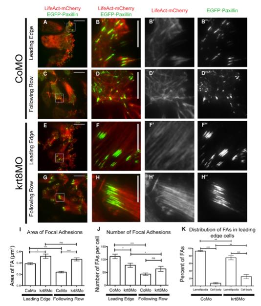 Fig. 3. Focal adhesion dynamics and actin cytoskeleton are altered in krt8 morphant explants. (A,C,E,G) Representative TIRF images of mesendoderm explants expressing LifeAct- mCherry (red) and EGFP-paxillin (green). (B-Bâ²â²,D- Dâ²â²,F-Fâ²â²,H-Hâ²â²) Magnified views of the boxes in A, C, E and G, corresponding to merged (B,D,F,H) and separate LifeAct-mCherry (Bâ²,Dâ²,Fâ²,Hâ²) and EGFP- paxillin (Bâ²â²,Dâ²â²,Fâ²â²,Hâ²â²) channels. (I-K) Quantifications of FA area (I), FAs per cell (J) and distribution of FAs within cells (K), calculated from the first frames of nine movies for each condition (Movies 3-6) (nine individual explants per condition were imaged across three separate experiments; data are mean±s.e.m. *P<0.05; **P<0.01; ***P<0.001; ns, not significant). Scale bars: 25 μm in A, C, E and G; 10 μm in B, D, F and H. |