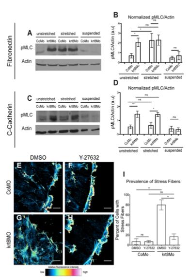 Fig. 5. pMLC is upregulated in keratin morphant mesendoderm. (A,C) Representative western blots of pMLC levels in control and krt8 morphant-dissociated mesendoderm cells. Silicone stretchers were coated with FN (A) or C-cad-FC (C). Following 1 h attachment, cells were subjected to 15 rounds of 10% cyclical stretch. Cell lysates were made immediately after stretching. Blots were then probed with antibodies against pMLC (S19) and actin. (B,D) Quantification of pMLC levels normalized to actin (n=5 for FN and n=4 for C-cad; data are mean±s.e.m. *P<0.05; **P<0.01; ns, not significant). (E-H) Confocal projections of phalloidin-stained explants on FN after 1 h treatment with Y27632 (10 μM) or DMSO. Pseudocolors correspond to the fluorescence intensity heat map. Control explant treated with DMSO (E) or 10 μM Y27632 (F); krt8 morphant explant treated with DMSO (G) or 10 μM Y27632 (H) (nine individual explants per condition were imaged across three separate experiments). (I) Percentage of cells with stress fibers in control and krt8 morphant explants treated with 10μM Y27632 or DMSO (number of cells counted: CoMO_DMSO=68, CoMO_Y27632=81, krt8MO_DMSO=59, krt8MO_Y27632=91; data are mean±s.e.m. **P<0.01; ns, not significant). Scale bars: 25 μm. |