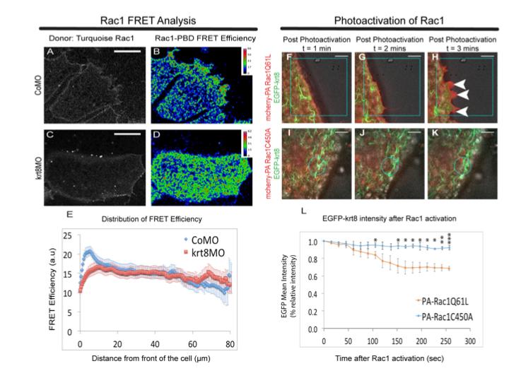 Fig. 6. Mutual antagonism of Rac1 GTPase activity and keratin IFs in leading edge mesendoderm. (A-D) FRET analysis of Rac1 activation in control and krt8 morphant mesendoderm. Confocal FRET imaging 1 h after plating DMZ explants on FN. Control (A,B) and krt8 morphant (C,D) explants showing distribution of donor Turquoise-Rac1 (A,C) and Rac1-PBD FRET efficiency (B,D) (nine individual explants per condition were imaged across four separate experiments). (E) Graph showing the distribution of FRET efficiency within leading edge cells in control and krt8 morphant explants. Data are mean±s.e.m. (total number of cells analysed: CoMo=24; krt8MO=29). (F-K) Confocal images of photoactivation of Rac1 in dissociated mesendoderm cells expressing mCherry-PA-Rac1Q61L (red) and EGFP-krt8 (green) (F-H) or nonphotoactivatable mCherry-PA-Rac1C450A (red) and EGFP-krt8 (green) (I-K). Regions irradiated with a 456 nm wavelength laser are indicated (boxes in F-H and circles in I-K). Times following irradiation: t=1 min (F,I); t=2 min (G,J); t=3 min (H,K). (L) Intensity of EGFP-krt8 after activation of photoinducible Rac1 constructs (three cells were analyzed per condition; data are mean±s.e.m. *P<0.05; **P<0.01; ***P<0.001). Scale bars: 25 μm. |