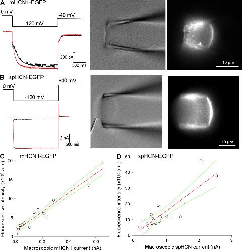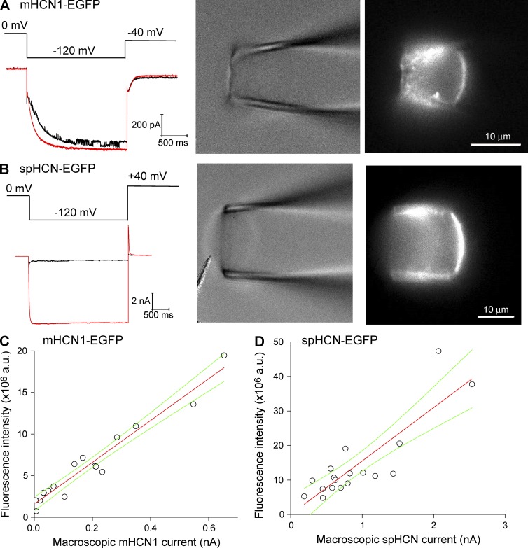 Figure 3. Cross-plots of fluorescence intensity versus current amplitude for mHCN1-EGFP and spHCN-EGFP channels. (A, left) Macroscopic current of the mHCN1-EGFP channel recorded with 3 µM cAMP in the bath. A voltage step from 0 to â120 mV was used for channel activation. Tail current was recorded at â40 mV. (B, left) Macroscopic current of spHCN-EGFP channel recorded with 30 µM cAMP in the bath. A voltage step from 0 to â120 mV was used for channel activation. Tail current was recorded at 40 mV. (A and B, right) The corresponding brightfield and fluorescence images. (C) Cross-plots of fluorescence intensity versus current amplitude for the mHCN1-EGFP channel. Linear fit statistics: Pearson correlation coefficient, 0.973. (D) Cross-plots of fluorescence intensity versus current amplitude for the spHCN-EGFP channel. Linear fit statistics: Pearson correlation coefficient, 0.859. Green curves show the confidence bands (95%).