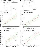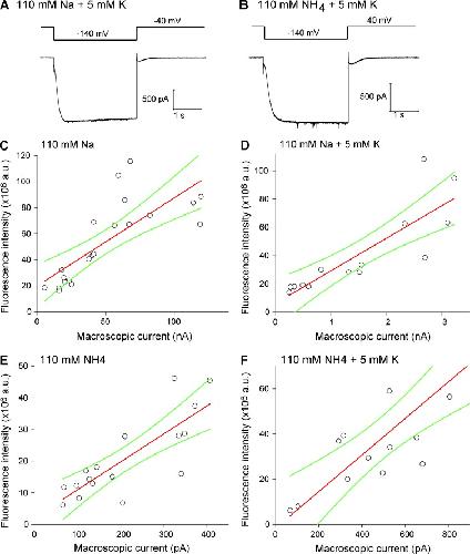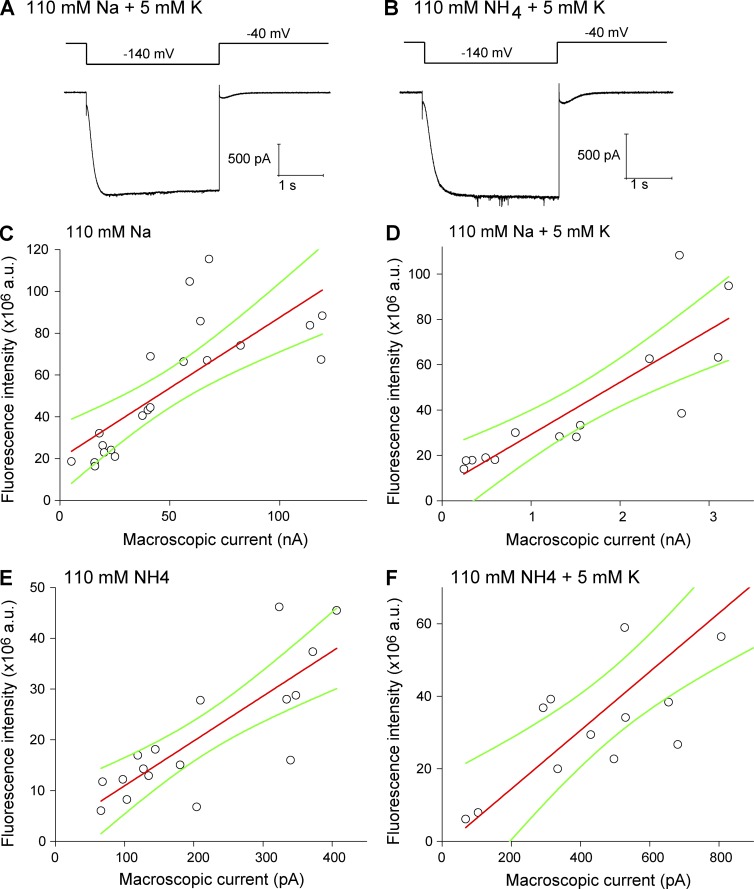 Figure 5. Determining the relative ionic selectivity for the mHCN2-EGFP channel. Symmetrical solutions were used on both sides of the membrane. All recordings were collected in the presence of saturating concentration of cAMP (3 µM). (A) Current trace recorded with solutions containing 110 mM Na+ and 5 mM K+ as the charge carriers. (B) Current trace recorded with solutions containing 110 mM NH4+ and 5 mM K+. (C) Cross-plots of fluorescence intensity versus current amplitude. Symmetric solutions contain 110 mM Na+ only. The slope was 0.676 a.u./pA. As the control, the slope of the condition with 110 mM K+ and 2 mM Na+ was 0.0067 a.u./pA. Thus, PK+/PNa+ based on the ratio of two slopes was 101 (in the absence of K+). Linear fit statistics: Pearson correlation coefficient, 0.766. (D) Results of 110 mM Na+ and 5 mM K+. The slope was 0.023 a.u./pA. PK+/PNa+ was 3.4 (in the presence of 5 mM K+). Linear fit statistics: Pearson correlation coefficient, 0.845. (E) Results of 110 mM NH4+ only. The slope was 0.088 a.u./pA. PK+/PNH4+ was 13.1 (in the absence of K+). Linear fit statistics: Pearson correlation coefficient, 0.811. (F) Results of 110 mM NH4+ and 5 mM K+. The slope was 0.081 a.u./pA. PK+/PNH4+ was 12.1 (in the presence of 5 mM K+). Linear fit statistics: Pearson correlation coefficient, 0.832. Green curves show the confidence bands (95%).