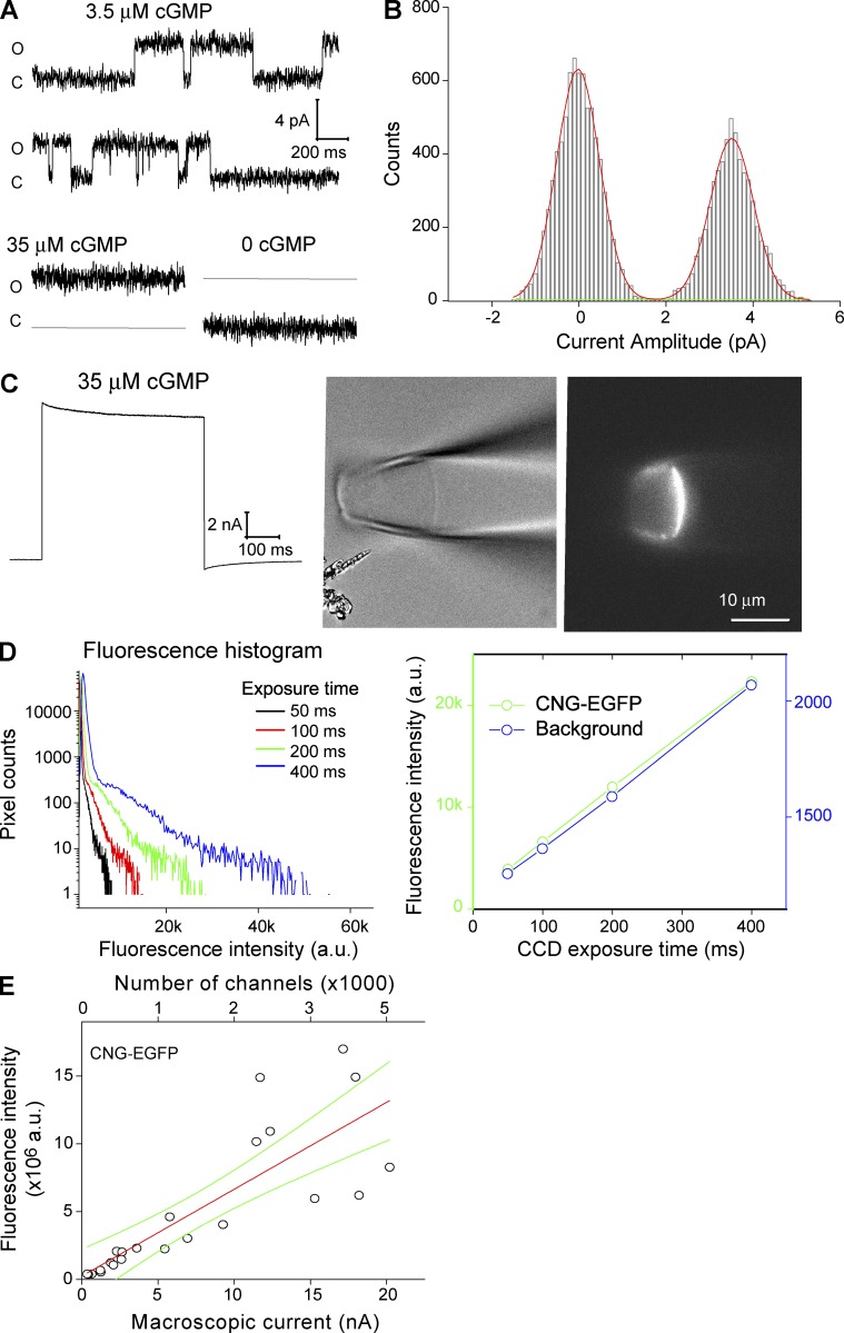 Figure 1. Use ROONS-EGFP as a model to determine the relationship between macroscopic fluorescence intensity and the total number of channels on the membrane patch. (A, top) Two single-channel traces of ROONS-EGFP channel recorded at the potential of 80 mV. Transitions between opening and closing were recorded in the presence of 3.5 µM cGMP, a subsaturating concentration for ROONS-EGFP. (bottom left) Maximal channel opening recorded with 35 µM cGMP. The current level corresponding to the closed state is indicated by a gray line. (bottom right) The current trace of the same patch recorded in the absence of cGMP. The gray line represents the current level of the open state. (B) Histogram of the top recording trace from A. Averaged amplitude of single-channel currents was 4.29 ± 0.57 pA (n = 7). (C, left) Macroscopic current recorded under 35 µM cGMP and a voltage step from 0 to 40 mV. (right) The corresponding brightfield and fluorescence images. (D, left) Histogram of the pixel intensities of the whole fluorescence image collected using four different exposure durations. The Cascade 1K is a 16-bit camera so that the pixel intensity ranges from 0 to 65,535. (right) Total fluorescence intensity from the ROI surrounding the patch of membrane patch (green) and the background (blue), which was separately recorded after moving the recording pipette out of the view. (E) Cross-plots of fluorescence intensity versus current amplitude. Two x axes show the macroscopic current (bottom) and the corresponding number of channels (top). The amplitude of single-channel current, 4.29 pA, was used in the conversion. Linear fit statistics: Pearson correlation coefficient, 0.823. Green curves show the confidence bands (95%).
