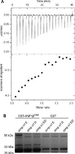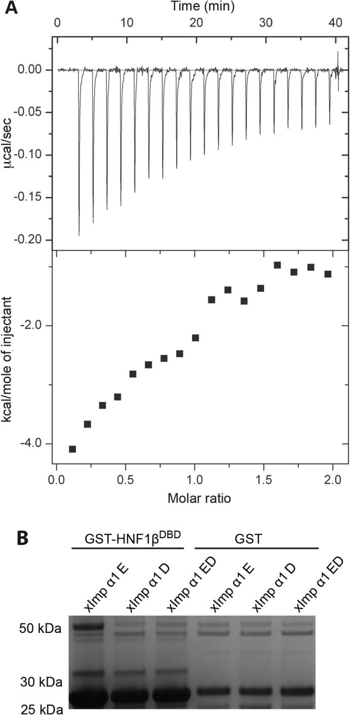 Fig. 4. (A) ITC titration for the binding of the HNF1β NLS peptide to ΔIBB mImportin-α1. Fitting the data (with χ2/DoF = 2.9 × 104) gave a Kd of 13.6 ± 1.5 nM for 0.94 ± 0.13 sites, ΔH = −7.2 ± 1.6 kcal/mol, ΔS = −1.7 cal/mol/deg. (B) In pull-down assays, GST-HNF1β bound only the E mutant of ΔIBB Xenopus Importin-α1 (that impairs NLS binding at the minor site) Mr 50 kD, but not the D mutant (that impairs binding at the major site) or ED double mutant (see Giesecke and Stewart, 2010).