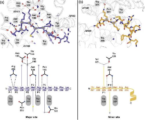 Fig. 6. Schematic illustration of the interactions of the HNF1βNLS peptide in the major (A) and minor (B) sites on ΔIBB mouse Importin-α1.