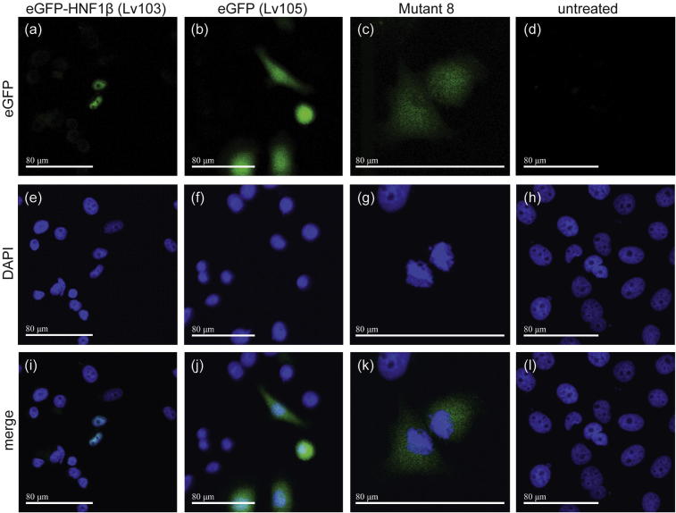 Fig. 2. eGFP imaging of PEO1 transduced lines with (a) eGFP-HNF1β (Lv103) showed primarily nuclear localisation of the GFP signal, whereas cells transduced with eGFP (Lv105) alone (b) showed both nuclear and cytoplasmic localisation. In cells transduced with eGFP-HNF1β (Lv103) in which the seven-residue NLS had been deleted (c, Mutant 8) the eGFP signal was mislocalized to the cytoplasm. The scale bar represents 80 μm. Images were taken on a Leica tandem confocal microscope using 20Ã, 40à and 60à objectives.