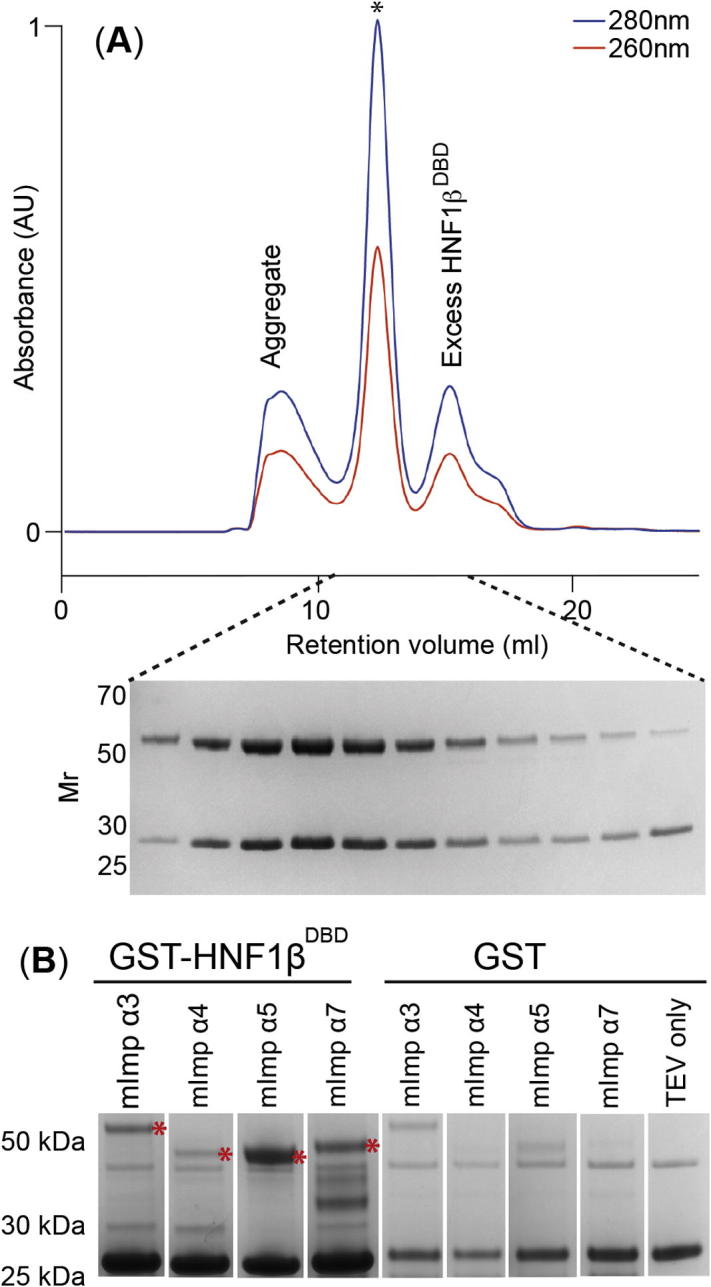 Fig. 3. (A) Stable complex formation between ΔIBB mouse Importin-α1 (50 kDa) and HNF1β (27 kDa) during size exclusion chromatography. Fractions were analysed by Coomassie stained SDS-PAGE (∗ marks the peak for the complex); (B) GST pull-down with liberated HNF1β showing pull-downs using different ΔIBB mouse Importin-α isoforms (red ∗).
