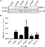 Fig. 1. (A) HNF1β protein expression levels in CCC cell lines OVISE, JHOC5, JHOC7, JHOC9, SKOV3 and a negative control HGSOC cell line, PEO1; (B) Data is the mean (n = 3, three biological replicates) and SEM. Expression levels were normalised to the housekeeping protein GAPDH. The expression levels observed with JHOC5 (P < 0.005, ∗∗∗) and OVISE (P < 0.05, ∗) cells were significantly higher than PEO1.
