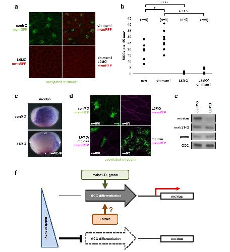 LARP6 regulates the expression of mcidas in ciliogenesis. a The depletion of LARP6 blocked ciliogenesis in a Notch-independent manner. dn-mam1 RNA and/or L6MO with memRFP mRNA or conMO with memGFP mRNA were injected into the right side or the left side, respectively. Embryos were fixed at stage 25. Cilia were stained with an anti-acetylated tubulin antibody. Following staining, lateral explants were prepared from embryos and images were taken by confocal microscopy. The scale bar represents 20 μm. b Quantification of number of MCCs from a. Three embryos were randomly chosen from each of three independent experiments. *â¤0.05, ****â¤0.0001. c mcidas expression in LARP6 morphants at stage 14 by WISH. Images from the left (conMO) or right (L6MO) lateral side were taken from the same embryo. Red-gal signals indicate L6MO injected side. a anterior, p posterior, d dorsal, v ventral. d Rescue experiments with mcidas mRNA (500 pg/blastomere) in LARP6 morphant MCCs. e LARP6 does not control the expression of mab21-l3 and gmnc genes. L6MO was injected into two blastomeres of 2-cell stage embryos and RNAs were isolated at stage 13 for semi-quantitative RT-PCR. f The model of LARP6 function in ciliogenesis. LARP6 controls the expression of mcidas in a Notch-independent manner. n indicates number of embryos examined