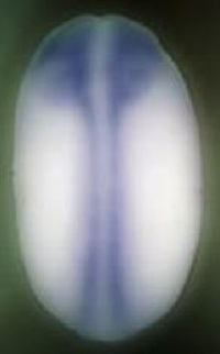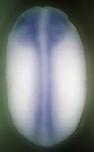 ) gene expression in Xenopus laevis embryo, assayed via in situ hybridization, NF stage 20, dorsal view, anterior up.