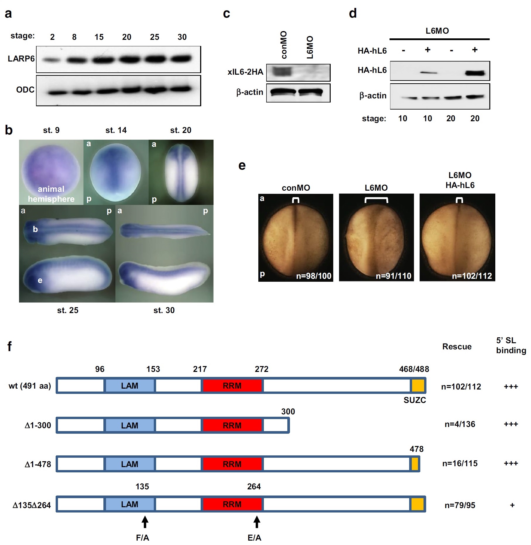 LARP6 morphants have neural tube closure defects. a Temporal expression profiles of LARP6 gene. b Spatial expression profiles of LARP6 gene. c LARP6 MO (L6MO) but not control MO (conMO) depleted X. laevis LARP6 protein (xlL6-2HA) in late neurula stage embryos. conMO or L6MO was injected with xlL6-2HA mRNA, and LARP6 was detected by immunoblotting with anti-HA antibody. d Human LARP6 (HA-hL6) was not knocked down by L6MO in stage 10 or 20 embryos. e Depletion of LARP6 resulted in neural tube closure defects. conMO, L6MO (15 ng/blastomere) and/or HA-hL6 mRNA (250 pg/blastomere) were injected into two dorsal blastomeres of 4-cell stage embryos (between animal pole and marginal zone). Images are dorsal views of late neurula stage embryos. f The summary of rescue experiments: the C-terminus of LARP6 is important for neural tube closure. LAM La motif, RRM RNA recognition motif, SUZC SUZ-C motif. n indicates number of embryos examined. 5â²SL binding shows the interaction between LARP6 and the 5â² stem-loop region of collagen RNA. F phenylalanine, A alanine, E glutamic acid, a anterior, p posterior, b brain, e eye. ODC and β-actin were used as a loading control