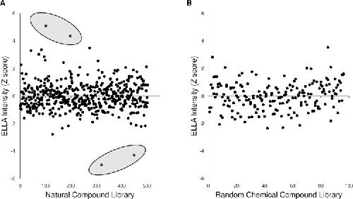 Fig 3. High throughput screening yielded putative muco-active reagents from the compounds library.A. The result of natural compound library screening. Data were analyzed by calculating the Z-score which indicates how far an individual score is away from the mean of a data set. Four putative muco-active reagents which have a Z-score over 4 or below -4 were selected for further analysis. B. The screening results of a random chemical library from NCBI. The random chemical library did not yield any muco-active reagents.