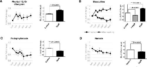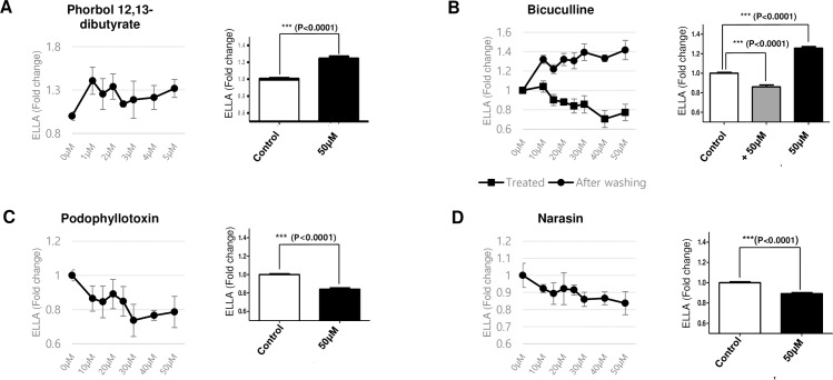 Fig 4. Putative muco-active reagents affecting mucus secretion level.The mucus level in the media upon the treatment of increasing doses of individual chemicals was normalized to those of control embryos and plotted on the graph (left panel, n = 5). The secreted mucus levels at 50uM of each natural compound were plotted (right panel, n = 39). P-values were calculated from studentâs t-test. A. Phorbol 12,13-dibutyrate is a known activator of PKC and promotes mucus secretion. B. Bicuculline is a GABA antagonist and inhibits mucus secretion. In the presence of bicuculline, mucus secretion was strongly inhibited (rectangle line); however, mucus secretion recovered after removing bicuculline (circle line). C. Podophyllotoxin is a known microtubule polymerization inhibitor with anti-viral and anti-tumor activities. Podophyllotoxin strongly inhibited mucus secretion from the Xenopus embryonic epithelium. D. An ionophoric coccidiostat, narasin inhibits mucus secretion.