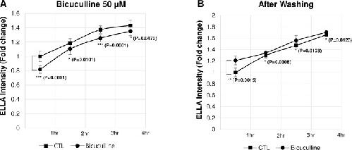 Fig 5. Bicuculline reversibly inhibits mucus secretion.Mucus secretion was analyzed in the presence of 50uM of bicuculline (A) or after changing the media without bicuculline at every 30 min (B). Mucus secretion was restored within 1 hour after removing bicuculline. P-values were calculated from student’s t-test (n = 4).